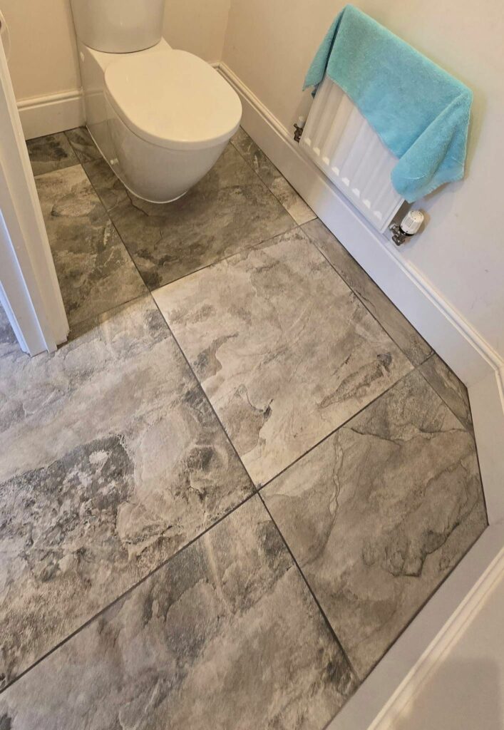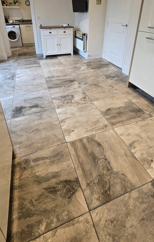 In this real residential home project in Thornton-Cleveleys, United Kingdom, the client chose the COLONIA GREY 60x60 stone-look porcelain tile for all the interior flooring. The project images clearly show why this material is an excellent solution for those wondering what type of porcelain tile to use inside a residential home with an anti-slip rating to prevent accidents while still being easy to clean on a daily basis.