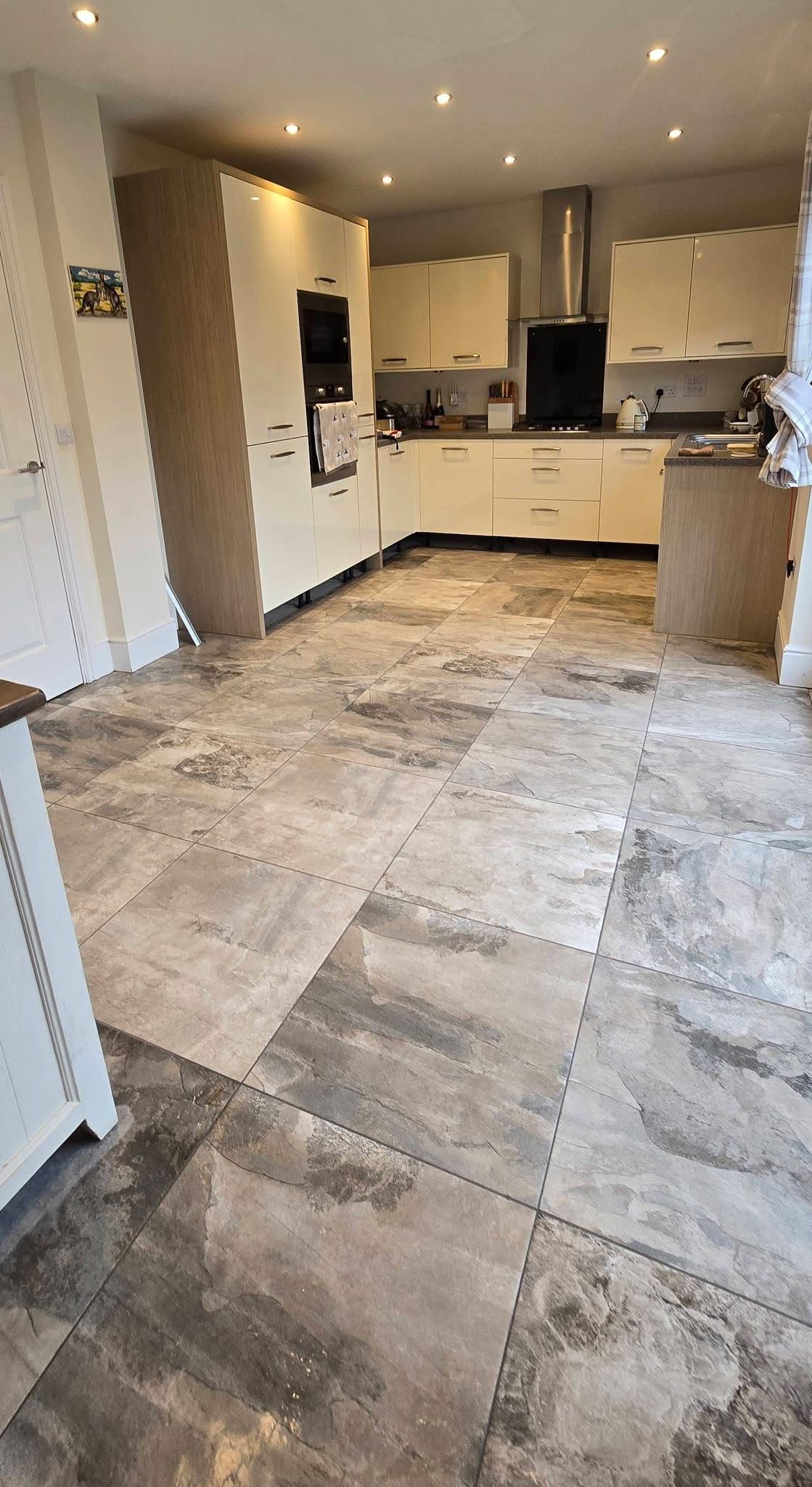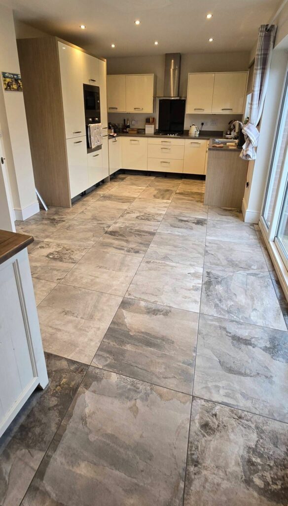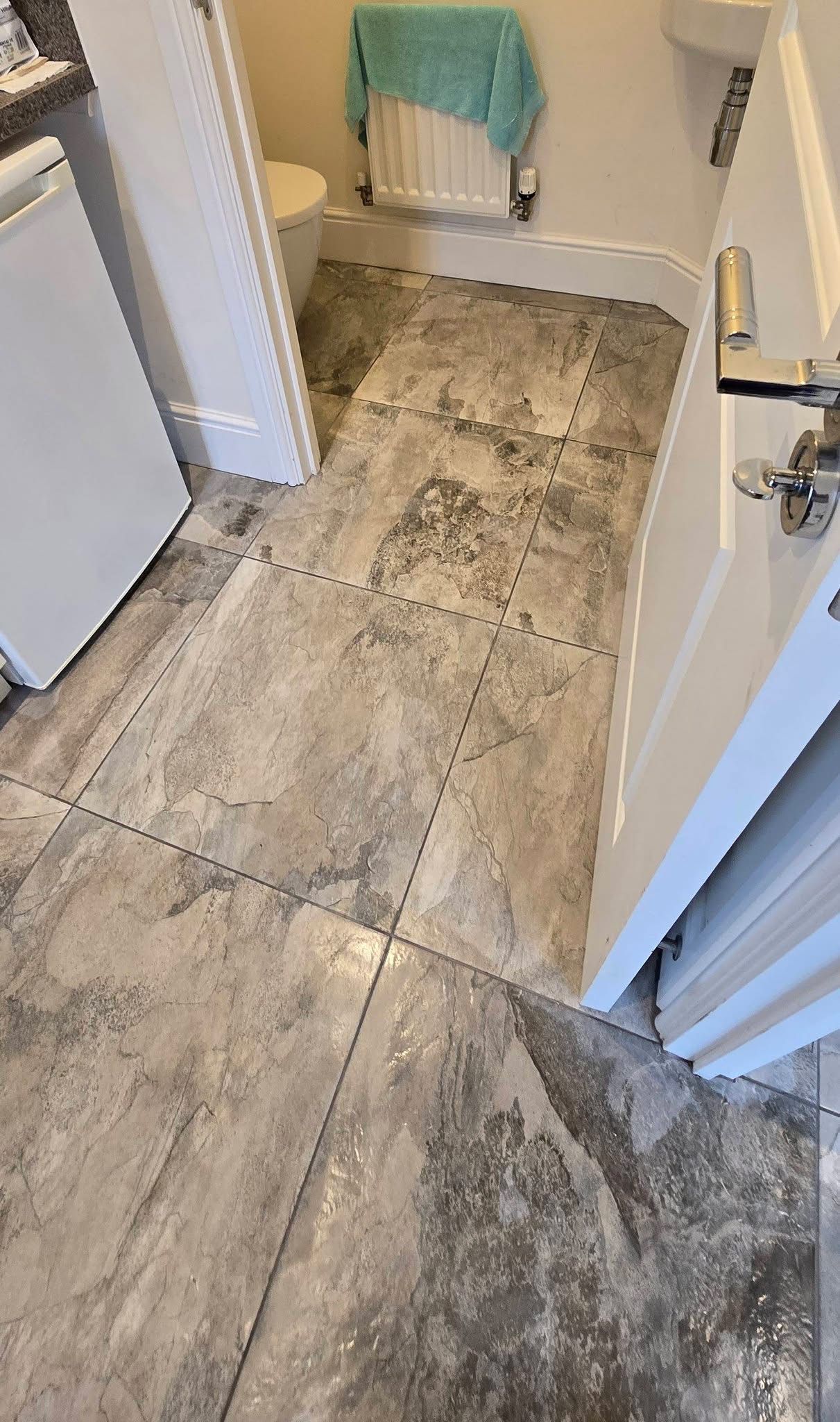 In this real residential home project in Thornton-Cleveleys, United Kingdom, the client chose the COLONIA GREY 60x60 stone-look porcelain tile for all the interior flooring. The project images clearly show why this material is an excellent solution for those wondering what type of porcelain tile to use inside a residential home with an anti-slip rating to prevent accidents while still being easy to clean on a daily basis.