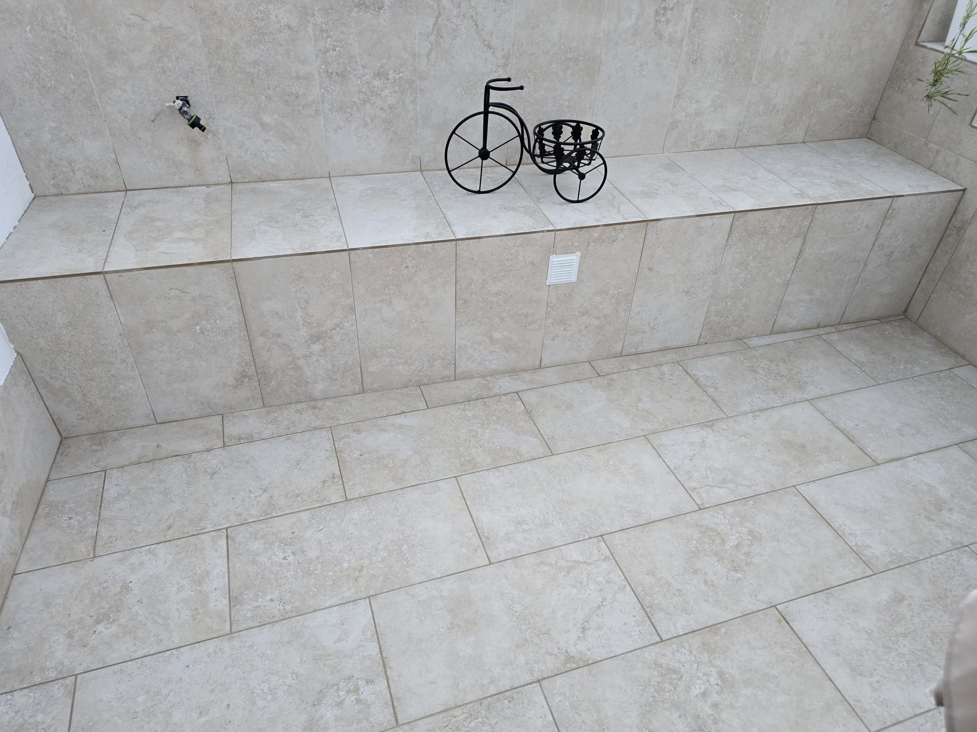 Si te preguntas por qué utilizar azulejo porcelánico en una terraza, este proyecto lo explica muy bien: ofrece durabilidad, facilidad de limpieza y un acabado que convierte cualquier terraza en un espacio acogedor y moderno. Además, el formato 30×60 permitió un diseño visualmente equilibrado, aportando sensación de amplitud y continuidad.