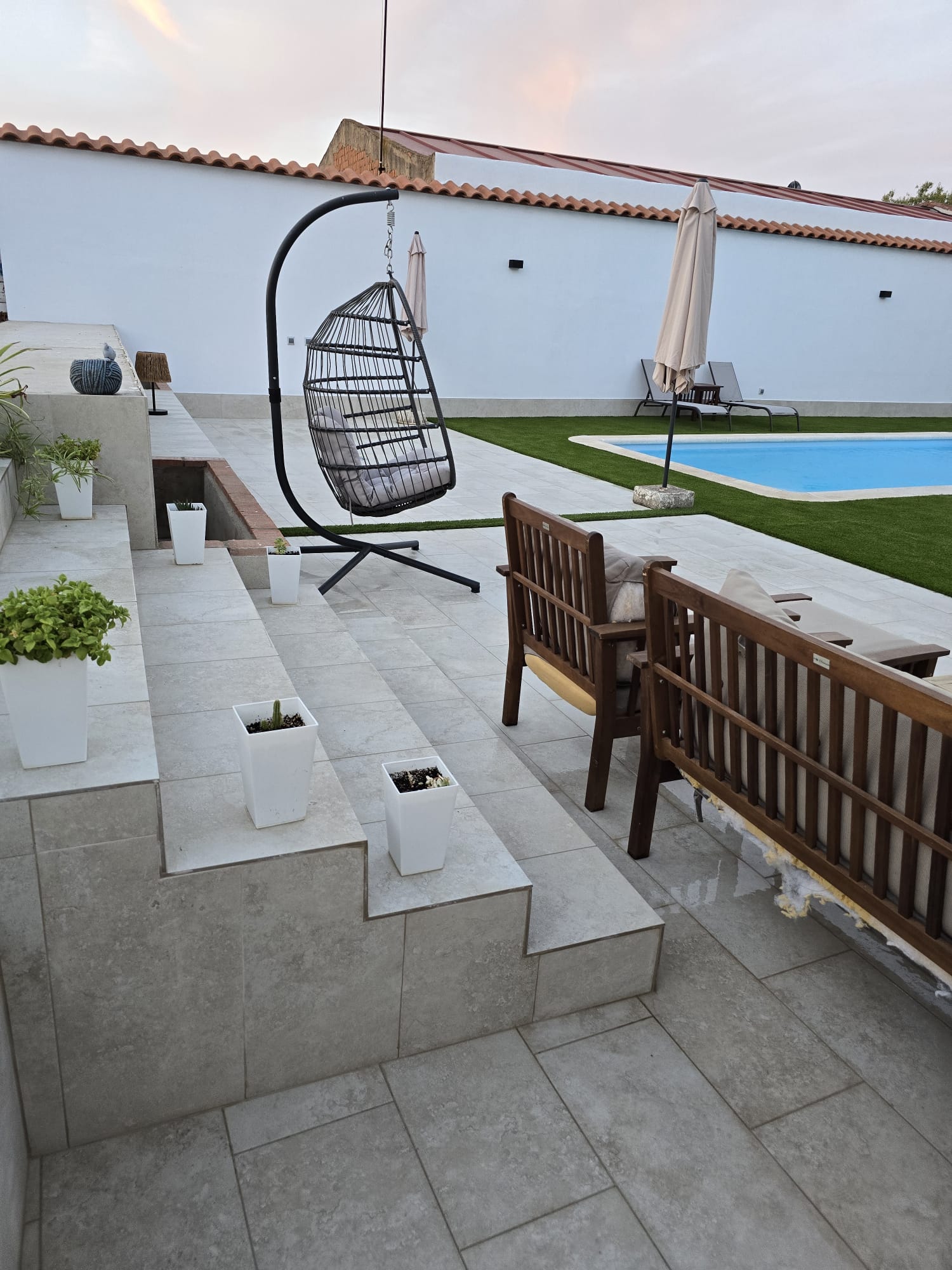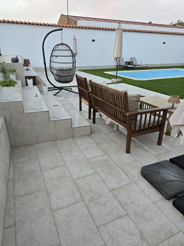La seguridad fue otro aspecto clave. Al estar la terraza conectada al jardín y cerca de la piscina, se optó por un azulejo porcelánico antideslizante. Esto asegura un pavimento seguro, incluso en zonas húmedas, y evita accidentes al caminar descalzo o con niños jugando.